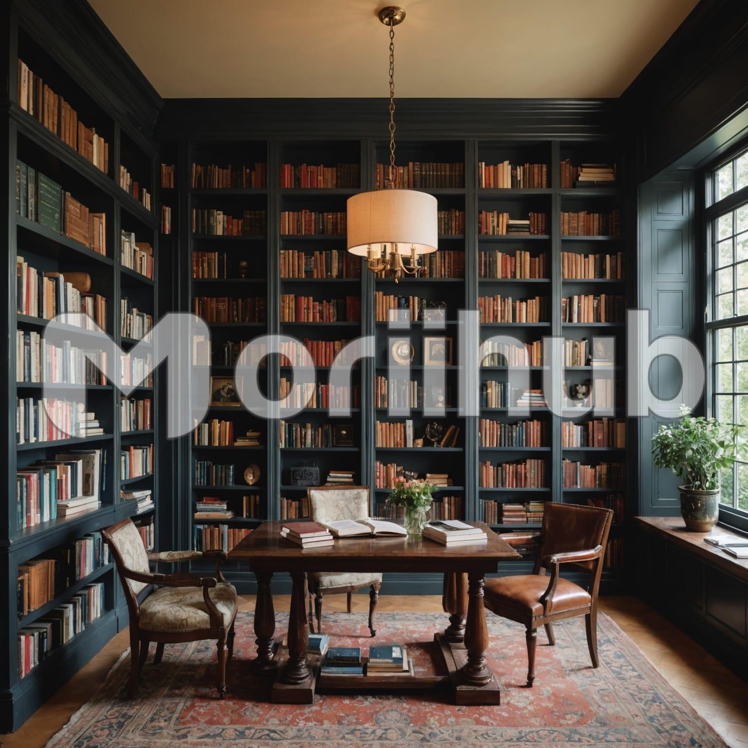 Books are neatly arranged on shelves lining the walls of a cozy study, their spines a mix of faded and crisp. A sturdy wooden table sits in the center, surrounded by a few chairs. Some books are spread open on the table, others stacked in small piles, as if recently browsed. The room feels lived-in, a quiet space for thought and reflection, where the scent of old pages lingers, and the worn chairs invite one to sit and delve into a story.