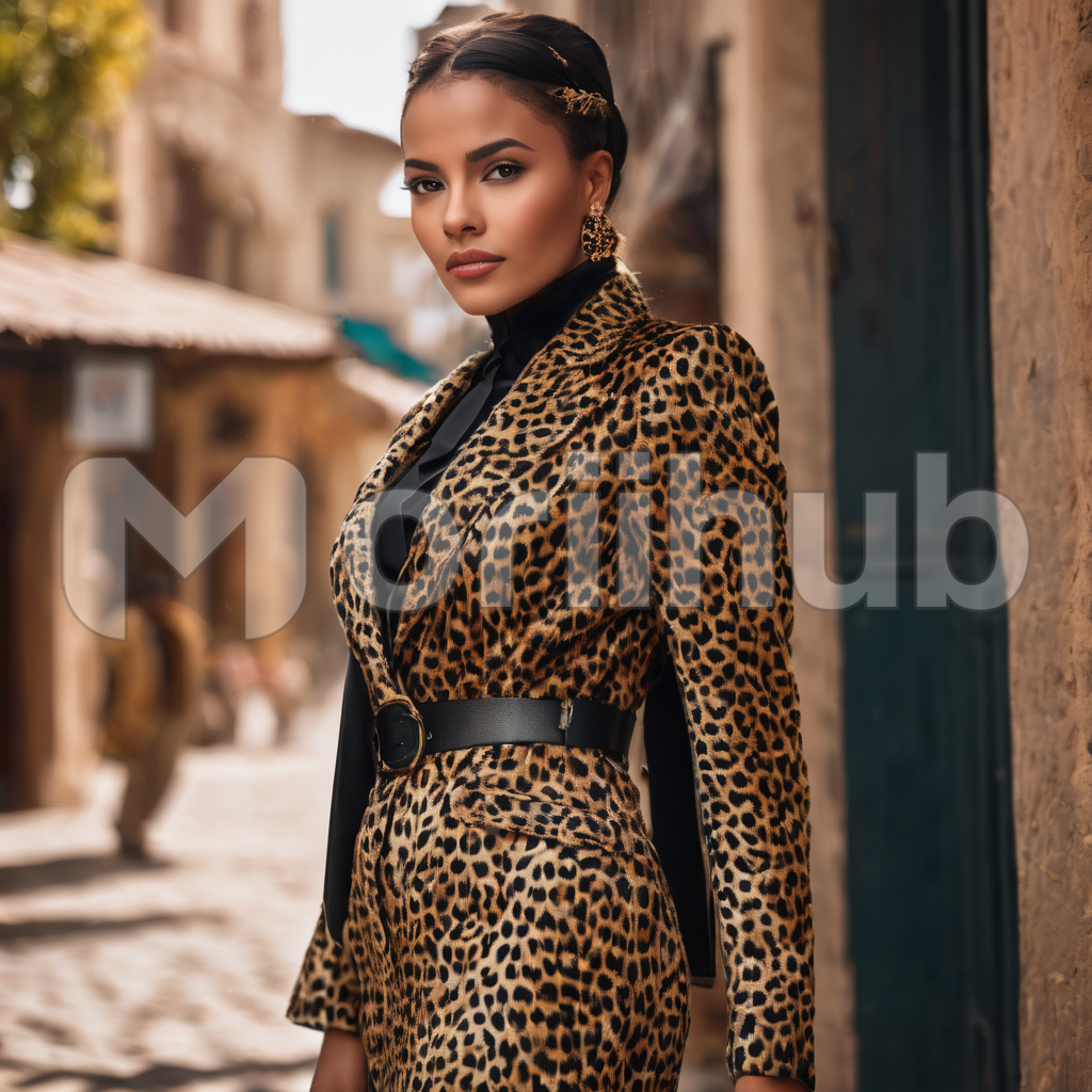 Amidst the urban bustle, a striking woman commands attention as she walks with purpose. Her gaze forward, she exudes confidence and elegance, accentuated by her leopard print overcoat draped gracefully over her shoulders. Despite the surrounding chaos, she remains composed, a vision of poise and allure against the city backdrop. With each step, she captivates onlookers, her presence a testament to timeless beauty and sophistication amidst the urban jungle.