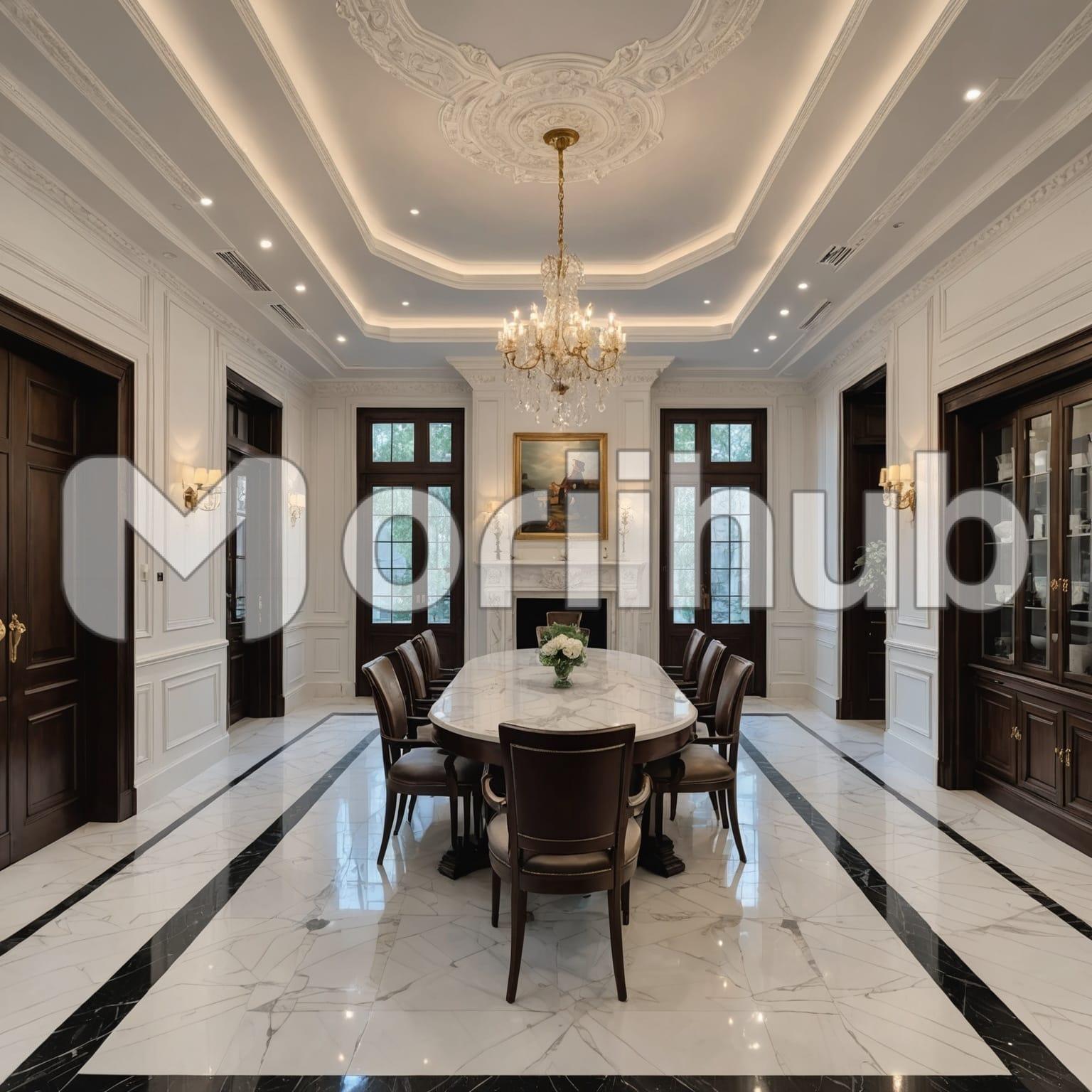 A dining area features a round table at its center, surrounded by neatly arranged chairs that invite guests to sit and enjoy a meal. The chairs encircle the table with a sense of symmetry, creating a welcoming and cozy atmosphere. Above, a chandelier hangs from the ceiling, adding a touch of elegance to the space. Its design enhances the room’s ambiance, casting a soft glow that highlights the table setting below. The overall layout feels balanced and refined, making the dining area a charming spot for gathering and sharing moments.