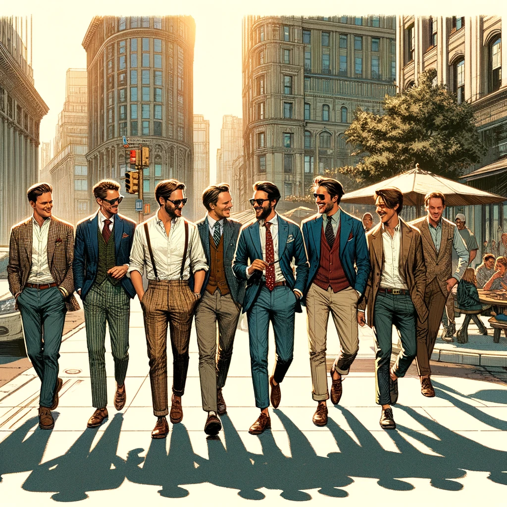 Strolling down the bustling city street, a group of men exude camaraderie and effortless style. Clad in a mix of casual and smart attire, their fashion choices speak volumes about their personalities. From tailored jackets to relaxed jeans, they stride with confidence, each step a testament to their bond and individual flair.
