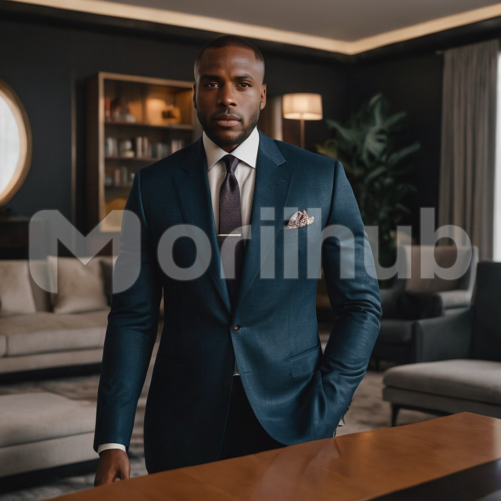 In the elegant living room, a stylish man dons a tailored suit, exuding confidence and refinement. With a relaxed demeanor, one hand casually rests in his pocket, adding a touch of nonchalant charm to his demeanor. The room’s ambiance complements his sophistication, with tasteful décor and soft lighting creating an atmosphere of understated luxury. Poised and composed, he epitomizes suave elegance in his surroundings.