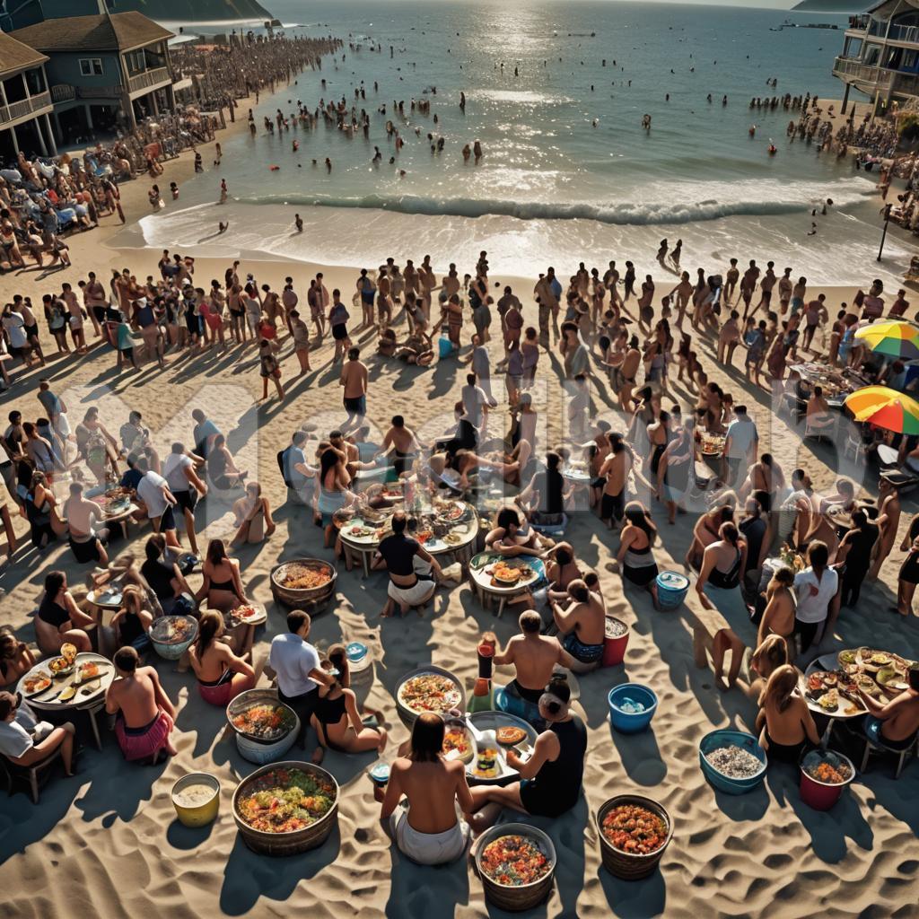 At the beach party, laughter mingles with the sound of crashing waves as friends gather under the golden sun. Tents and umbrellas dot the sandy shore, offering shade and respite. Volleyball matches and Frisbee tosses animate the coastline, while BBQ grills perfume the air with savory scents. With cold drinks in hand and toes buried in warm sand, the party-goers celebrate life’s simple joys amidst a backdrop of sea and sky, creating memories that will last a lifetime.