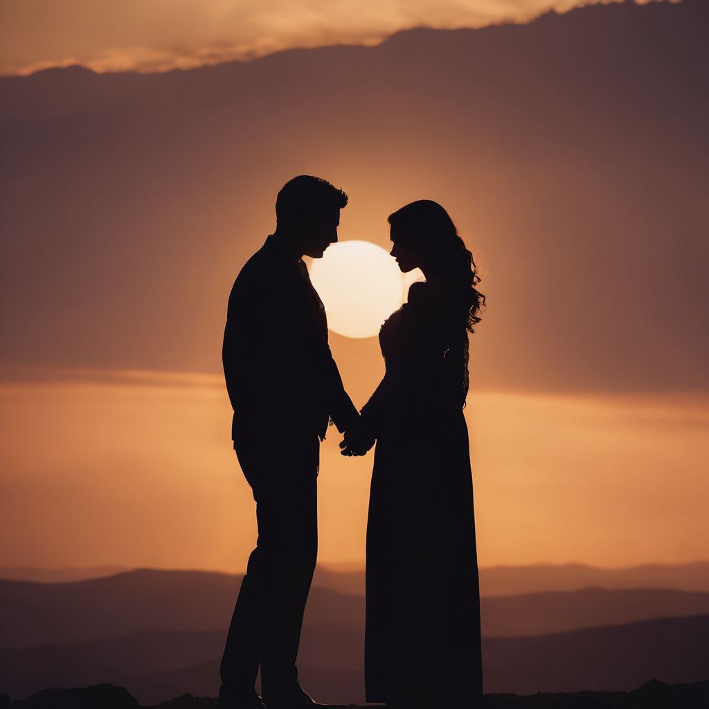 Silhouetted against the fading light of the setting sun, a couple stands face to face, hands gently clasped in an intimate connection. Their outlines meld into one against the colorful canvas of the twilight sky, creating a timeless moment of tenderness and love. In the quiet serenity of the evening, their bond is illuminated by the soft glow of dusk, a symbol of enduring affection and companionship.