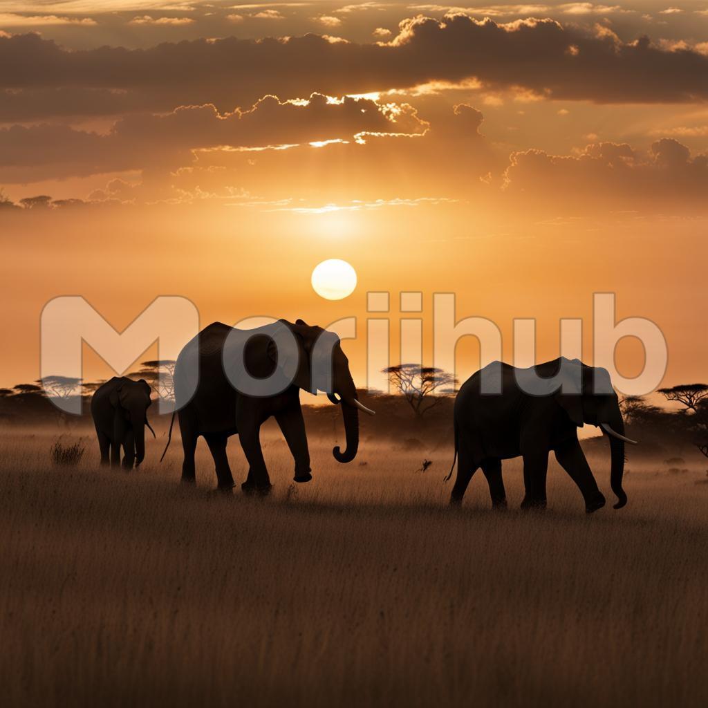 A breathtaking scene unfolds on the savannah as the sun dips below the horizon, casting a warm glow. Silhouetted against the fading light, a majestic parade of elephants moves with purpose, their towering forms weaving through the golden grass. The tranquil atmosphere resonates with the rumble of their footsteps. The silhouette of these gentle giants against the sunset creates an awe-inspiring tableau, a poignant reminder of the harmony between wildlife and the vast, untamed beauty of the African savannah.