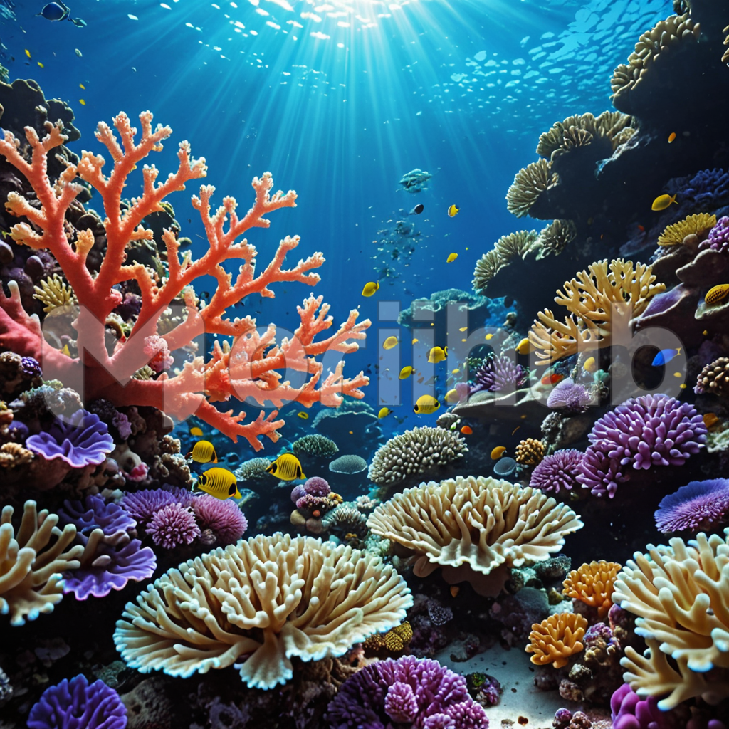 Beneath the sea’s surface lies a mesmerizing coral reef, a kaleidoscope of vibrant hues. Sunlight filters through the water, casting ethereal beams that dance upon the intricate formations. Coral polyps sway gently in the currents, teeming with life. Fish dart amongst the labyrinth of coral, adding bursts of color to the underwater tapestry. In this serene realm, nature’s beauty flourishes, illuminated by the soft glow of sunlight peeking through the aquatic expanse.