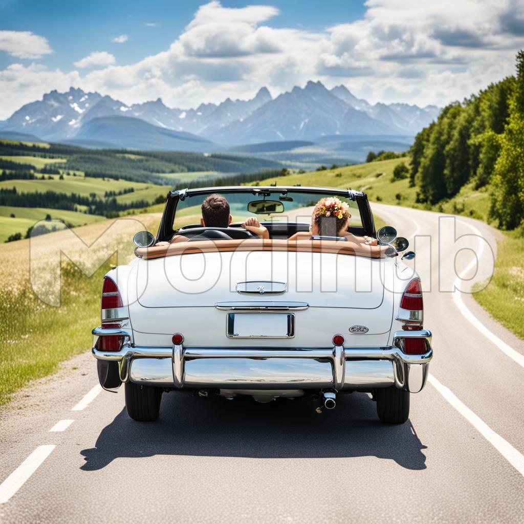 In the embrace of a vintage convertible, a carefree couple embarks on a sun-kissed road trip adventure. The azure sky is adorned with playful clouds, casting intermittent shadows on the winding highway ahead. With the wind tousling their hair, the couple shares laughter and joy as they journey through the open expanse. On one side of the highway, lush green bushes form a verdant border, their leaves swaying in rhythm with the passing breeze. The sun intermittently filters through the fluffy clouds, creating a dynamic interplay of light and shade on the scenic landscape. As they drive, the couple becomes a fleeting moment in a larger tapestry of freedom, sunshine, and the open road.