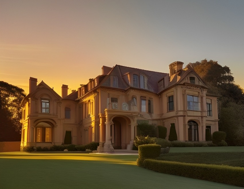 As the sun gracefully descends, a warm, golden glow envelops a magnificent mansion, turning its facade into a canvas of ethereal beauty. The intricate details of the architecture catch the fading sunlight, creating a symphony of shadows and highlights. The windows reflect the amber hues, mirroring the fiery palette of the sky. In the corner of the scene, the mansion’s expansive lawn basks in the soft radiance, transforming into a carpet of muted greens and long shadows. Trees stand as sentinels, their silhouettes etched against the fading daylight. The sunset’s glow imparts a serene elegance to the entire tableau, casting a tranquil spell over the grand estate and its sprawling grounds.