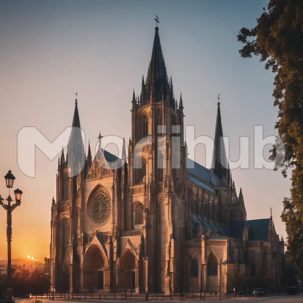 As the sun bids adieu, a cathedral stands in majestic silhouette against the fading hues of sunset. The dimming sky casts a tranquil ambiance over the architectural marvel. A lone tree in the corner adds a touch of earthly grace, juxtaposing nature with the divine. This harmonious scene captures the cathedral’s timeless grandeur, where the ethereal glow of sunset and the solemnity of the sacred edifice converge in a moment of serene beauty.