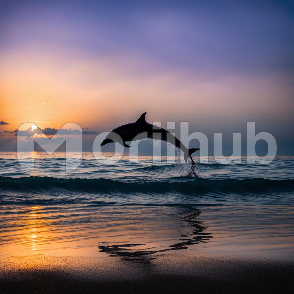 Against the canvas of dusk, a majestic silhouette emerges—a dolphin gracefully diving into the ocean depths. The fading sunlight paints the sky in hues of orange and pink as the sleek form breaks through the water’s surface. The dolphin’s arched shape captures a moment of fluid beauty, a harmonious dance between marine elegance and the twilight sea. A scene unfolds where nature’s poetry is whispered through the silhouette of a graceful marine acrobat.