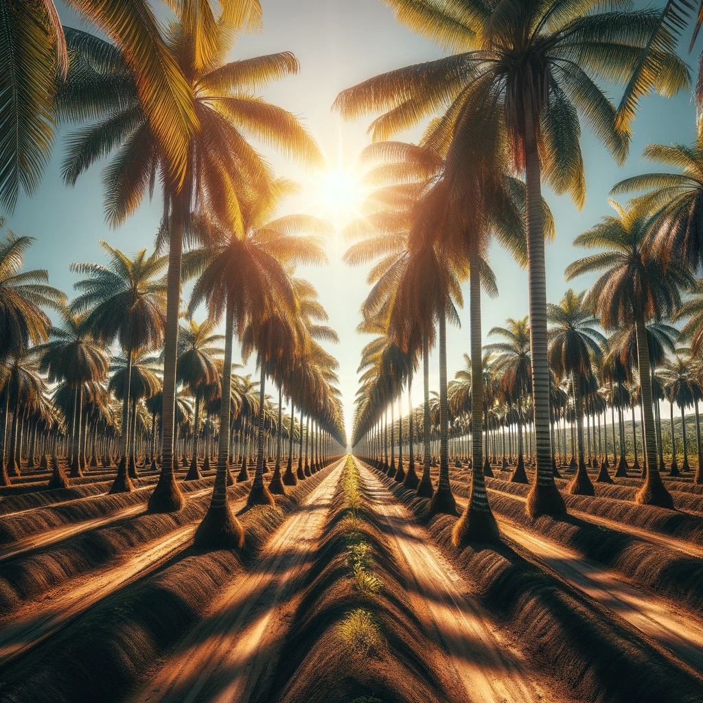 Beneath the radiant tropical sun, a sprawling palm tree plantation stretches as far as the eye can see. Row upon row of tall palms sway gently, their verdant fronds dancing in the warm breeze. Against the azure sky, the rhythmic motion creates a mesmerizing symphony of nature’s beauty, a tranquil oasis under the sun’s golden embrace.