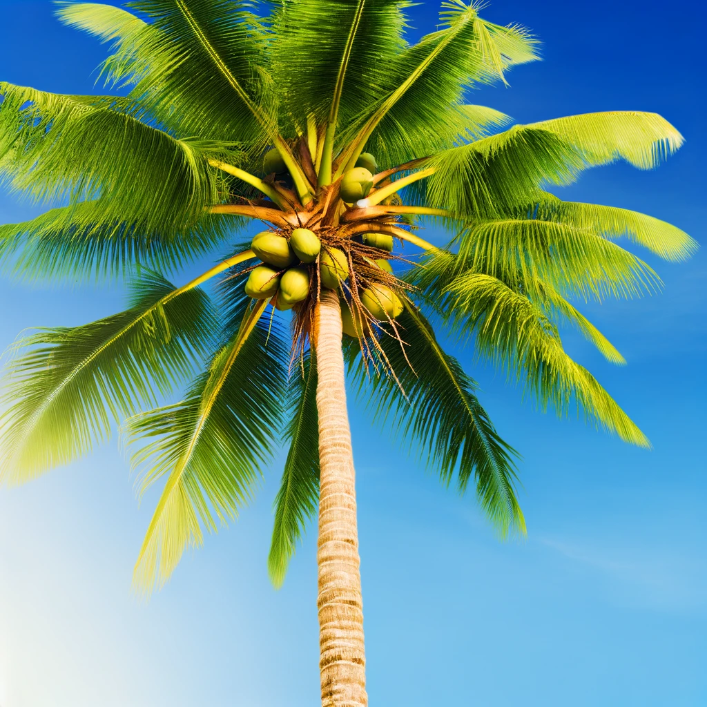 Against the backdrop of a clear blue sky, a tall coconut tree stands tall, its slender trunk gracefully curving upwards towards the heavens. Its lush green fronds sway gently in the breeze, casting playful shadows on the sun-kissed ground below. It’s a scene of tranquil beauty, epitomizing the tropical allure of paradise.