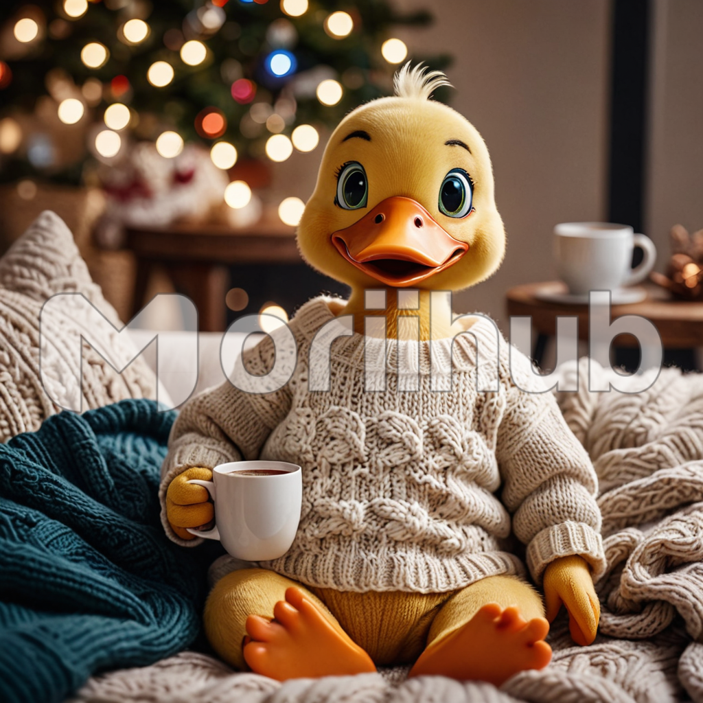 Perched inside, an animated duck cozily sports a snug sweater, its vibrant colors matching its lively spirit. With webbed feet nestled beneath, it cradles a steaming cup of hot chocolate, the aroma enveloping the air. Its bright eyes twinkle with delight as it takes small sips, relishing each warm gulp. Seated in contentment, it radiates comfort and joy, a whimsical sight amidst the indoor sanctuary. The duck’s animated gestures add a playful charm, making it the heartwarming centerpiece of this cozy scene.