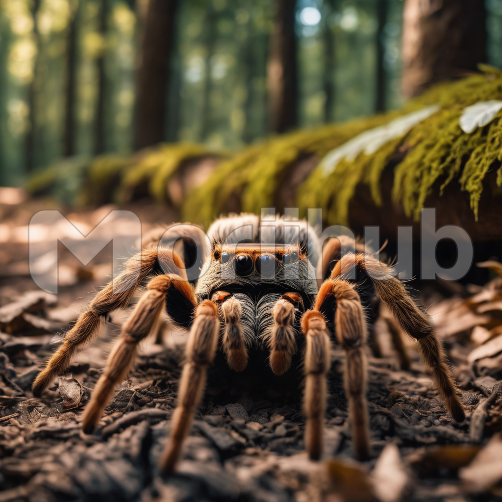 A tarantula, with its hairy legs and enigmatic presence, ventures across the forest floor with a deliberate grace. Its movements are a mesmerizing dance of primal instinct. Amidst the dappled sunlight filtering through the canopy above, the tarantula navigates fallen leaves and mossy terrain, an ancient predator in its lush, natural realm. Its journey symbolizes the intricate and often misunderstood beauty of the forest’s microcosm, a place where every creature plays a vital role.