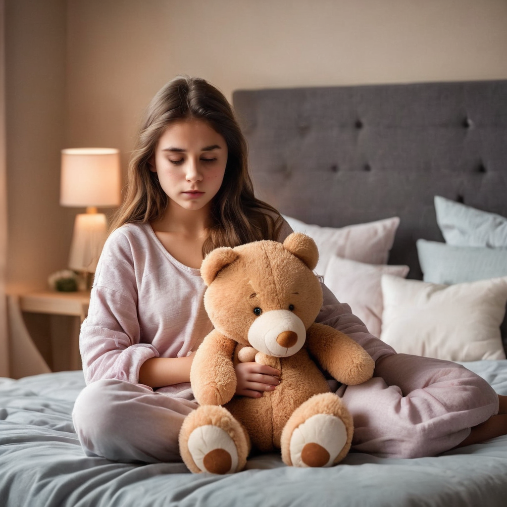 Nestled in the comfort of her bed, a girl holds her teddy bear close, finding solace in its furry embrace. Soft lamplight in the corner casts a warm glow, illuminating a scene of bedtime tranquility. The teddy, a cherished confidant, echoes the innocence of youth, while the gentle ambiance of the lamp imparts a sense of security. In this tender tableau, a bedtime ritual unfolds, where a girl and her teddy share quiet moments before dreams weave their enchanting tales.