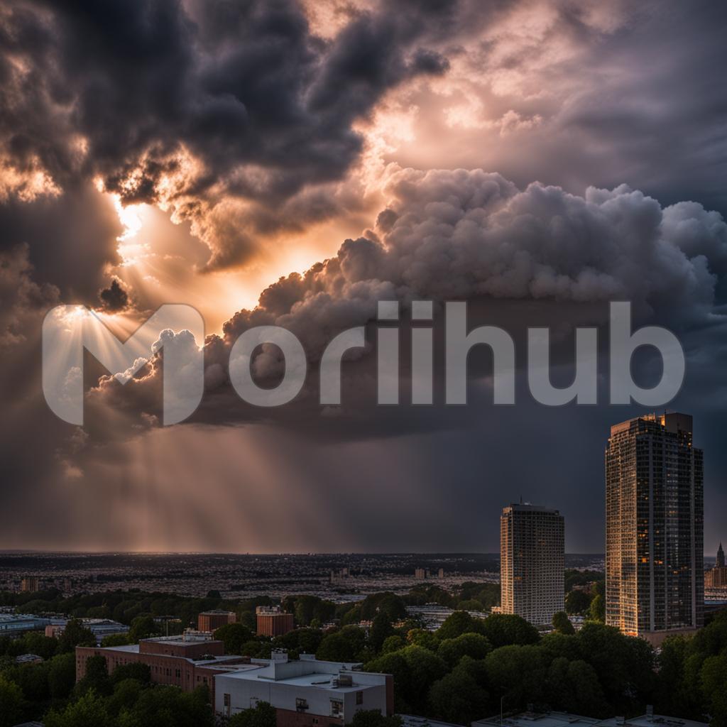 Dramatic storm clouds gather menacingly over the cityscape, casting an ominous shadow. Amidst the impending tempest, shards of sunlight defiantly pierce through, creating an ethereal contrast. The juxtaposition of impending darkness and the persistent sunbeams paints a scene of atmospheric tension. The city below braces for nature’s tumultuous dance, caught between the impending storm’s brooding embrace and the resilient rays of a sun determined to illuminate the impending drama.