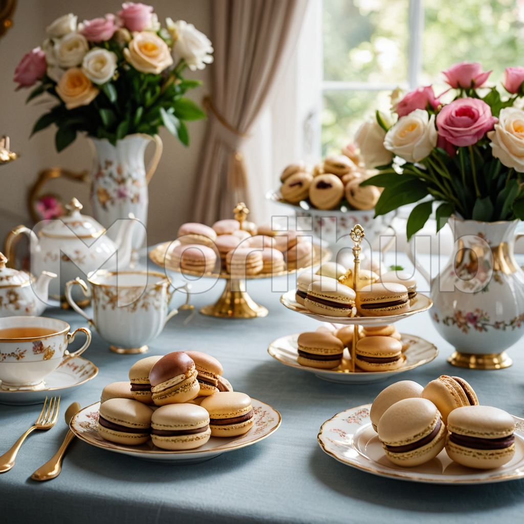 Delicate macarons rest elegantly on porcelain plates atop the table, their vibrant hues catching the light in a display of irresistible charm. Each petite treat promises a symphony of flavors, awaiting the eager palate of the indulgent. In the corner, a steaming cup of tea adds to the scene, its fragrant aroma mingling with the sweet scent of the macarons. Together, they invite a moment of blissful indulgence and serene enjoyment.