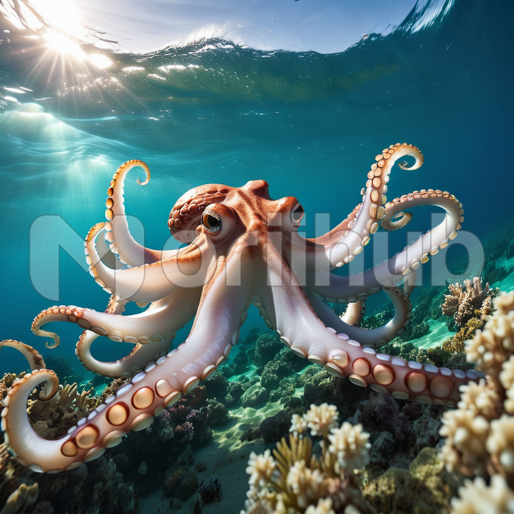Beneath the ocean’s surface, an octopus glides with effortless grace, its tentacles undulating like delicate ribbons in the current. Above, sunlight filters through the water, casting ethereal rays that dance upon its translucent skin. With keen eyes and curious tendrils, it explores its liquid realm, a master of disguise and agility. In this tranquil underwater world, the octopus reigns supreme, a symbol of mystery and wonder beneath the shimmering waves.