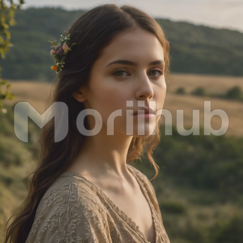 A beautiful woman stands poised, her gaze fixed forward with an air of captivating confidence. Behind her, a lush backdrop of vibrant greenery frames the scene, accentuating her natural allure. Her features radiate grace and allure, embodying the timeless beauty of nature itself. In this harmonious moment, she becomes a living embodiment of the enchanting interplay between humanity and the lush world that surrounds her.