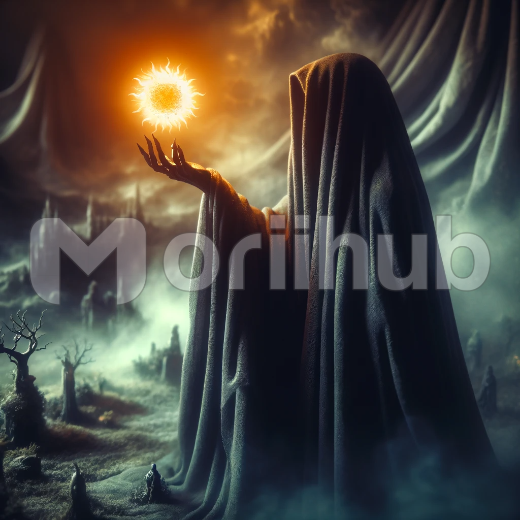 In a desolate land shrouded in shadows beneath a somber sky, a cloaked figure emerges. With an air of mystique, it holds aloft a miniature sun in its outstretched hand. The ethereal glow casts a warm, solitary light that pierces the darkness, illuminating the barren landscape. This enigmatic scene symbolizes a glimmer of hope amidst desolation, an embodiment of the power to bring light to even the darkest of places.