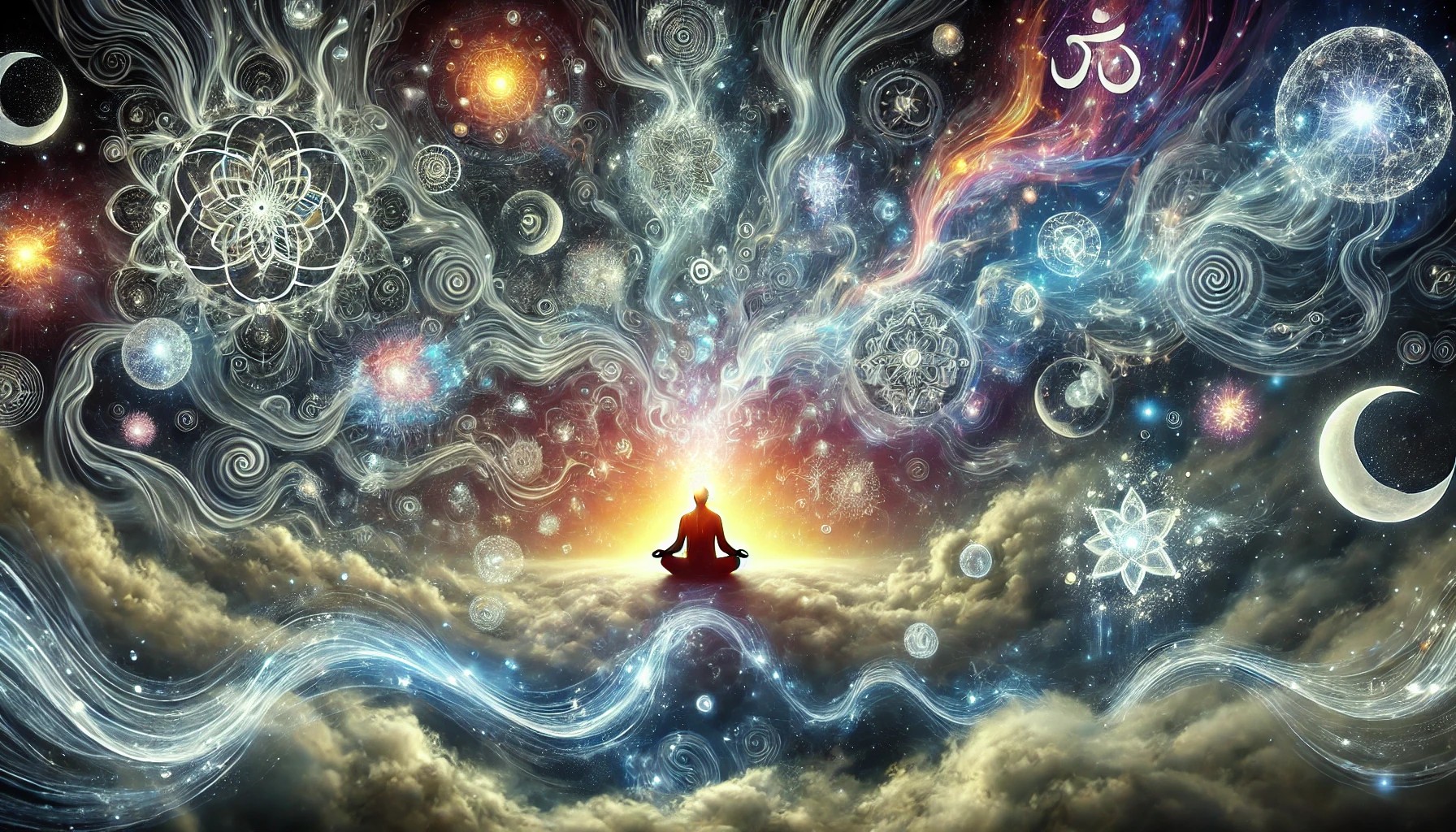 This illustration captures a surreal and mystical journey into the depths of the mind. At the center, a meditating sage floats in a vast, dreamlike expanse, suspended in an ethereal void where thoughts take form. Their eyes glow with inner wisdom, radiating immense psychic energy that ripples outward, subtly distorting reality itself.
