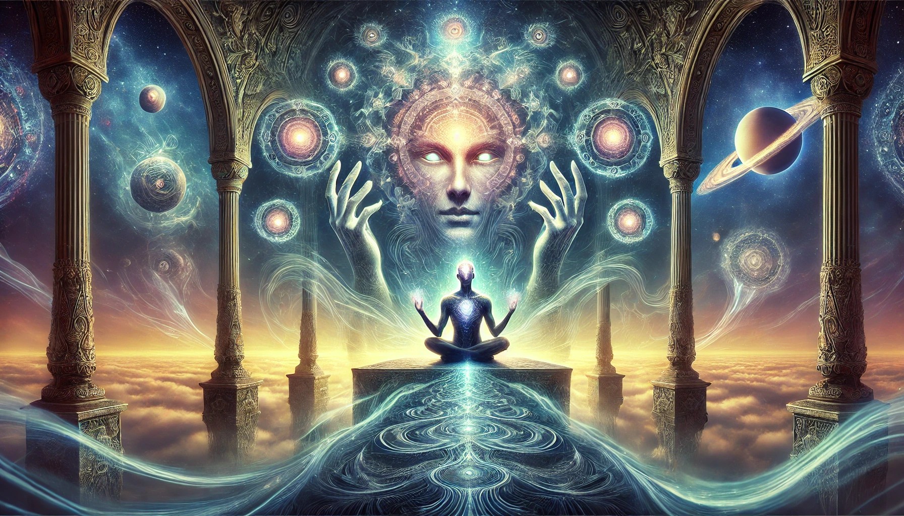 This illustration captures a surreal and mystical moment where the boundaries of consciousness and reality blur. At the center, a mystical figure sits in deep meditation within an ancient, floating temple, their eyes glowing with arcane wisdom. Waves of psychic energy ripple outward from their mind, shaping the air into intricate symbols and visions that seem to come alive.