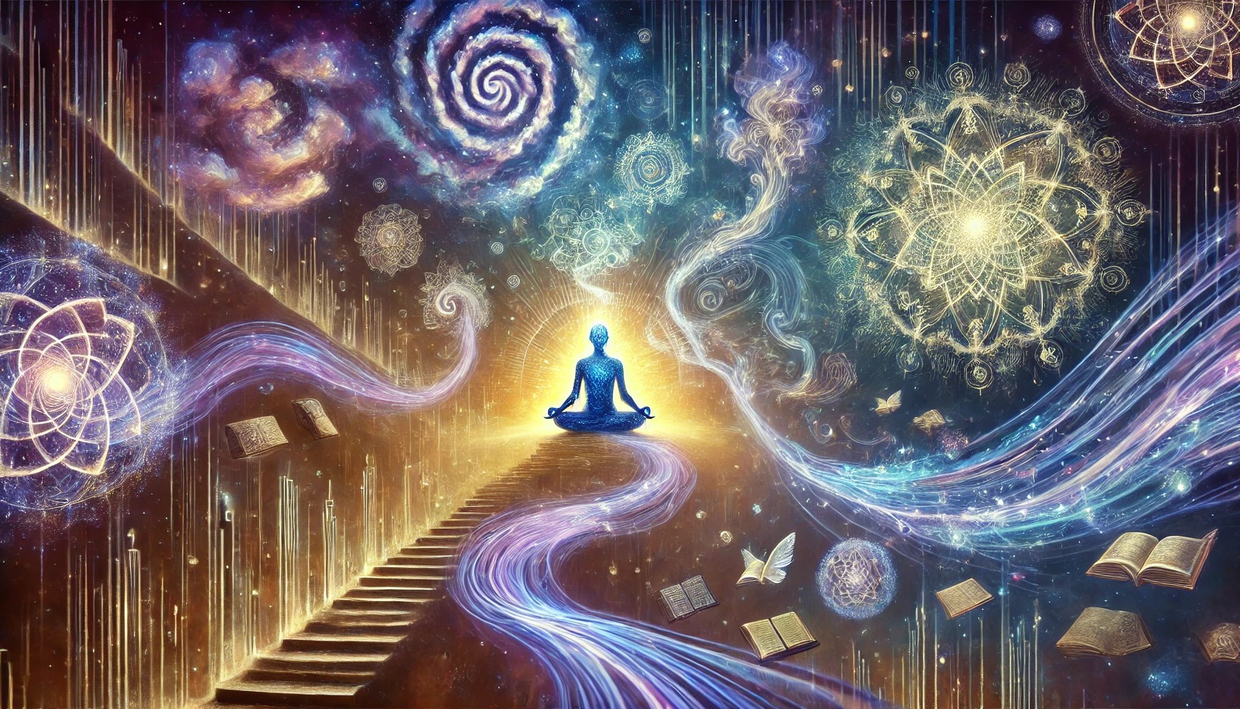 This illustration captures a surreal and mystical journey into the depths of the mind and consciousness. At the center, a meditating sage floats weightlessly in a vast astral realm, surrounded by glowing streams of thought and memory. Their body is wrapped in swirling wisps of energy, forming intricate symbols that represent knowledge, emotion, and the secrets of the universe. Their eyes glow with ancient wisdom as they navigate the limitless landscape of their mind.