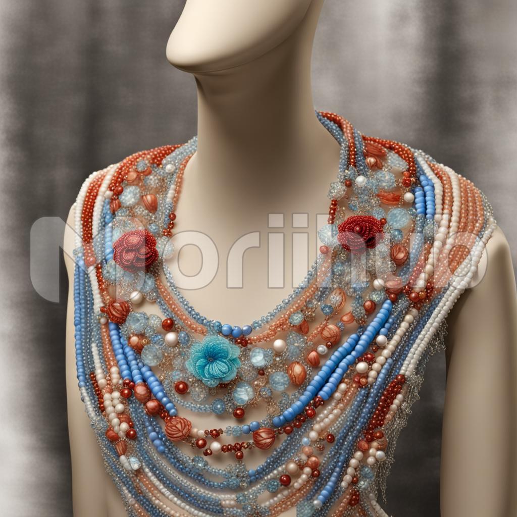 A mannequin stands adorned in exquisite beaded neckpieces, each strand a testament to craftsmanship and artistry. Vibrant hues and intricate patterns converge, creating a visual symphony of cultural expression. The beads, meticulously strung, cascade elegantly, capturing the essence of tradition and style. The mannequin becomes a canvas, showcasing the harmonious blend of colors and textures, inviting admiration for the beaded masterpieces that hang with poise, evoking a sense of timeless beauty.