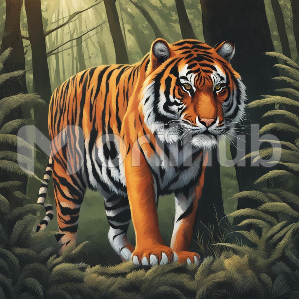 In this captivating painting, the majestic tiger leaps to life on the canvas. Its fur, a vibrant mosaic of orange and black, exudes a powerful elegance. Eyes ablaze with intensity, it evokes the wild spirit of the jungle. Every brushstroke captures the essence of untamed grace, making the tiger a mesmerizing centerpiece in this masterpiece—a testament to the artist’s skill in conveying both the ferocity and beauty of nature.