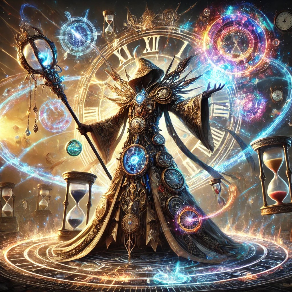 A time battle mage in a commanding pose, wielding a staff that channels the power of time itself. The mage’s robes are adorned with intricate clockwork and hourglass patterns, glowing with shifting colors that represent different moments in time. Arcane time magic swirls around them, forming clock faces, hourglasses, and temporal distortions. The background features a battlefield with fragments of past and future scenes, with timelines converging and splitting around the mage.