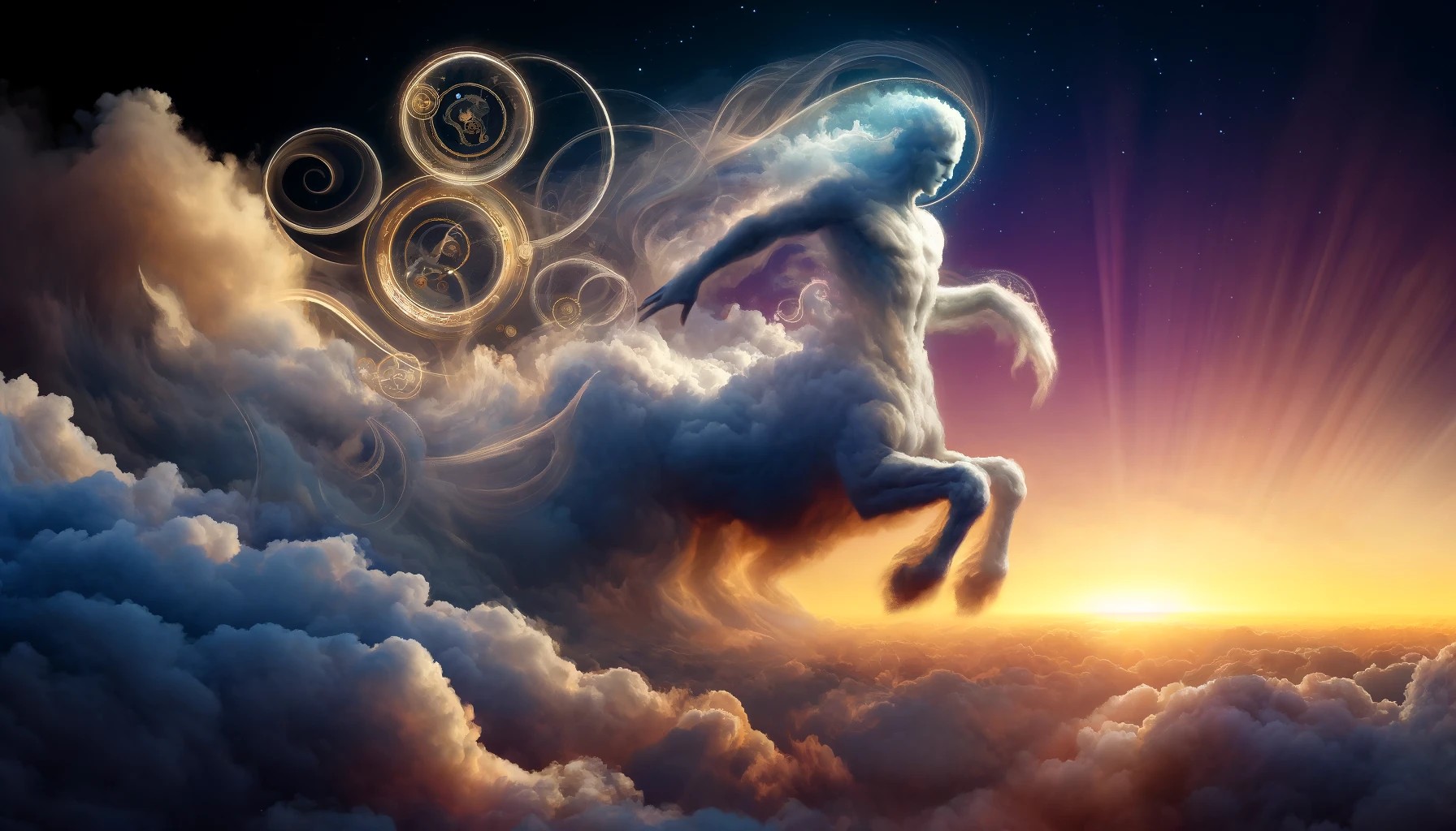 The image portrays a majestic cloud shaped like a centaur, blending seamlessly into a surreal, glowing sky. The centaur’s muscular upper body, with flowing arms and a partially dissolved mane, merges naturally with its galloping horse-like lower half made of soft cloud formations. Surrounding the centaur are swirling, glowing rings of golden light resembling ancient clockwork gears, symbolic of the time element.
