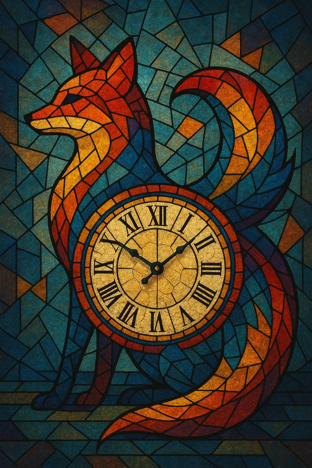 This image showcases a digital abstract mosaic in the shape of a fox, designed in the style of stained glass art. The fox is constructed from a complex array of vibrant geometric shapes, blending rich hues of red, orange, yellow, and blue to form its sleek silhouette. Embedded within the fox’s body is a large antique-style clock with Roman numerals, symbolizing the element of time.