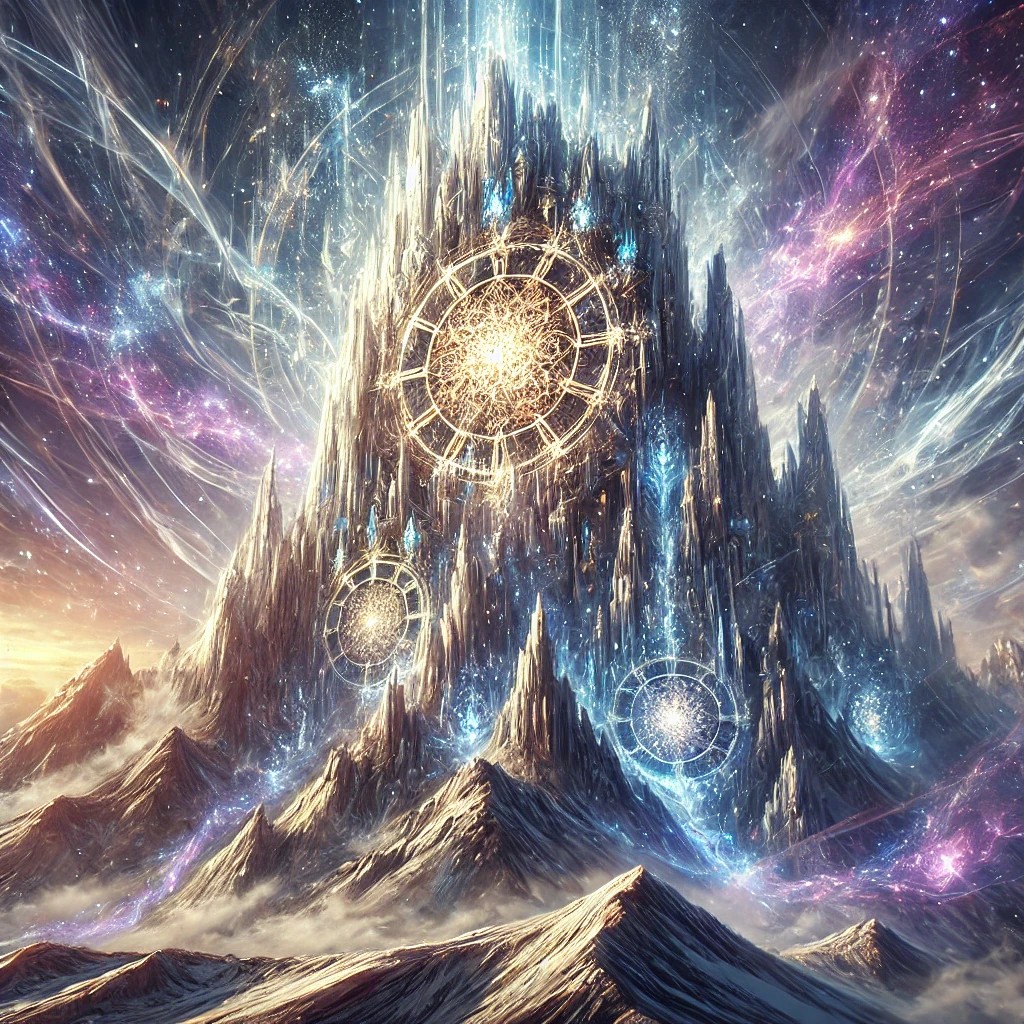 The image depicts a massive crystal mountain, its jagged peaks formed from shimmering transparent quartz. The mountain is infused with the time element, featuring ethereal streaks of gold, silver, and deep purple running through it, symbolizing the flow of time. The face of the mountain is intricately carved with glowing clockwork patterns, which seem to pulse with an otherworldly rhythm. Time appears to warp around the mountain, with faint glimpses of past and future eras flickering in the air.
