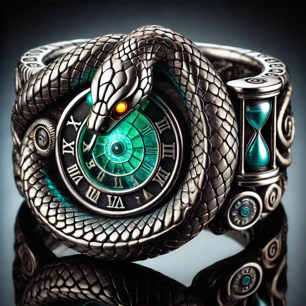 A “time snake ring,” featuring the coiling snake with glowing eyes, clockwork gears, and time symbols intricately woven into the design.