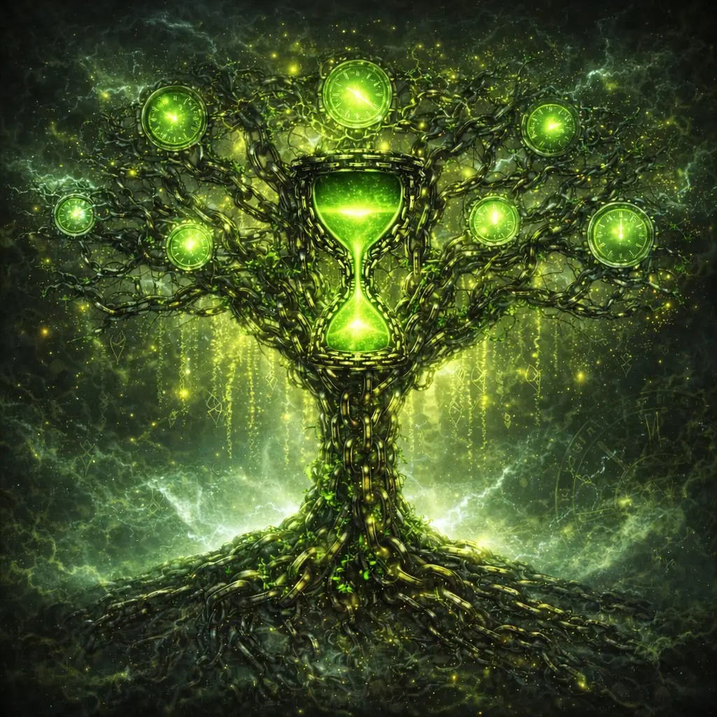 A surreal tree forged entirely from interlocking chains rises from the ground, its roots spreading outward like metallic veins gripping the earth. The trunk twists upward into branching limbs made of dark steel links, yet everything is illuminated by a vibrant green glow that pulses through the structure like living energy. At the center of the tree hangs a radiant green hourglass, its luminous “sand” flowing steadily downward, symbolizing time infused with life.