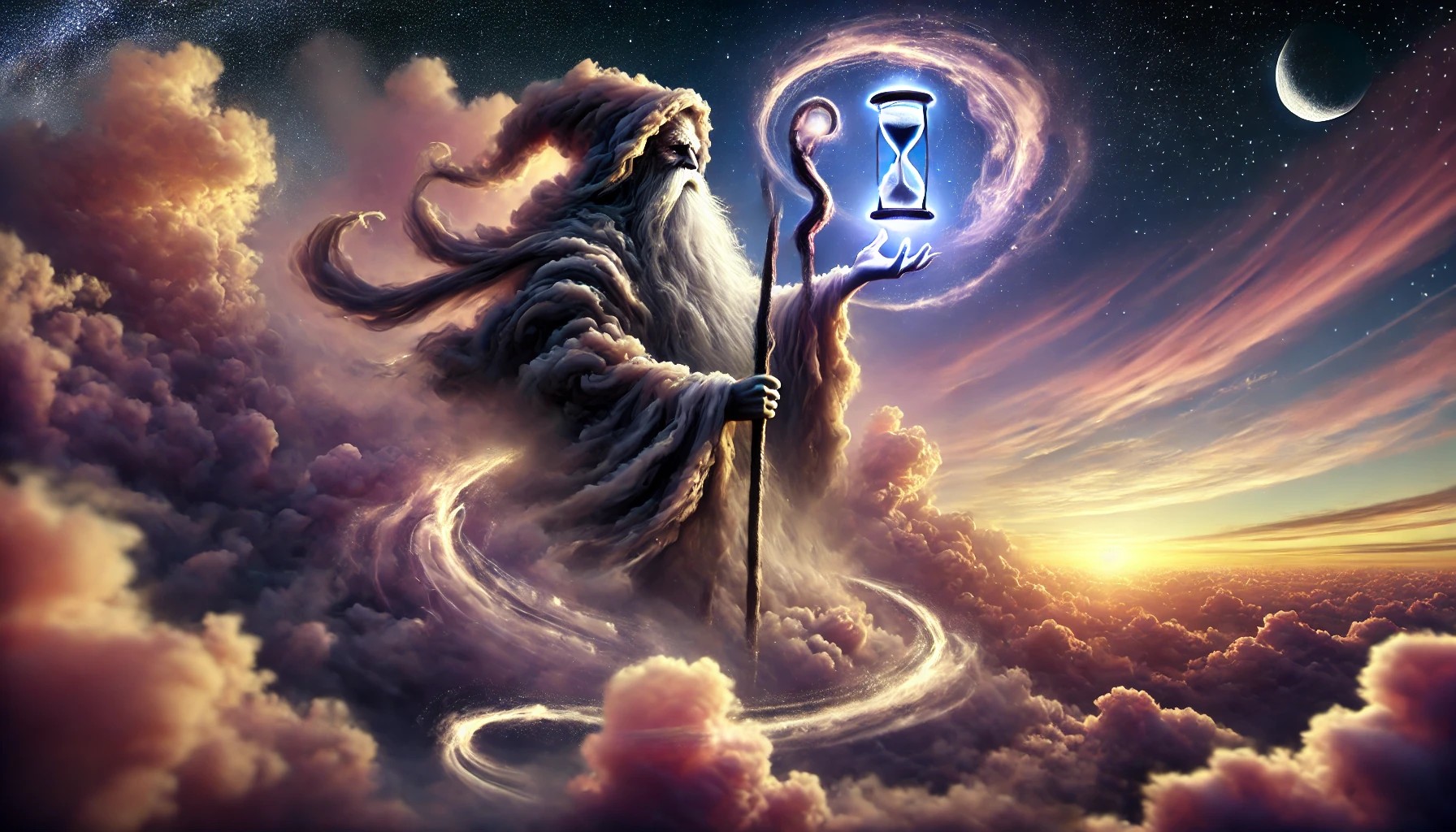 The image depicts a stunning twilight sky with a massive, mystical cloud formation in the shape of a wizard. The wizard’s flowing robes and long, mist-like beard blend seamlessly with the swirling clouds, creating an ethereal and magical figure. In one hand, the wizard holds a glowing staff shaped like an hourglass, with streams of golden light spiraling around it, symbolizing the flow of time.