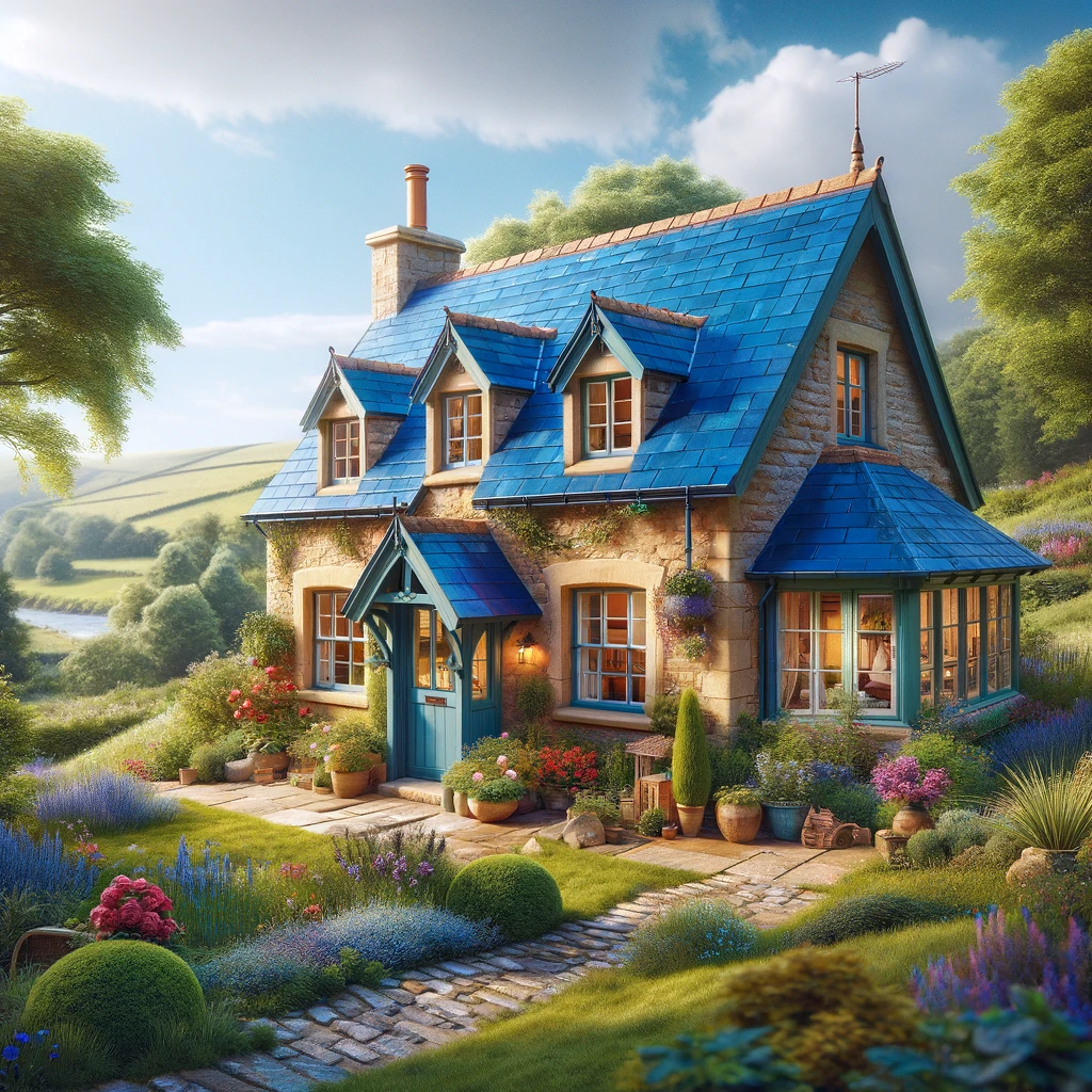 In the embrace of a serene countryside, a charming cottage unfolds, a sanctuary of coziness amidst nature’s splendor. Its vivid blue roof, a vibrant contrast to the lush greenery, beckons with warmth and charm. Nestled within idyllic surroundings, it exudes a timeless allure, inviting all to bask in its tranquil embrace.