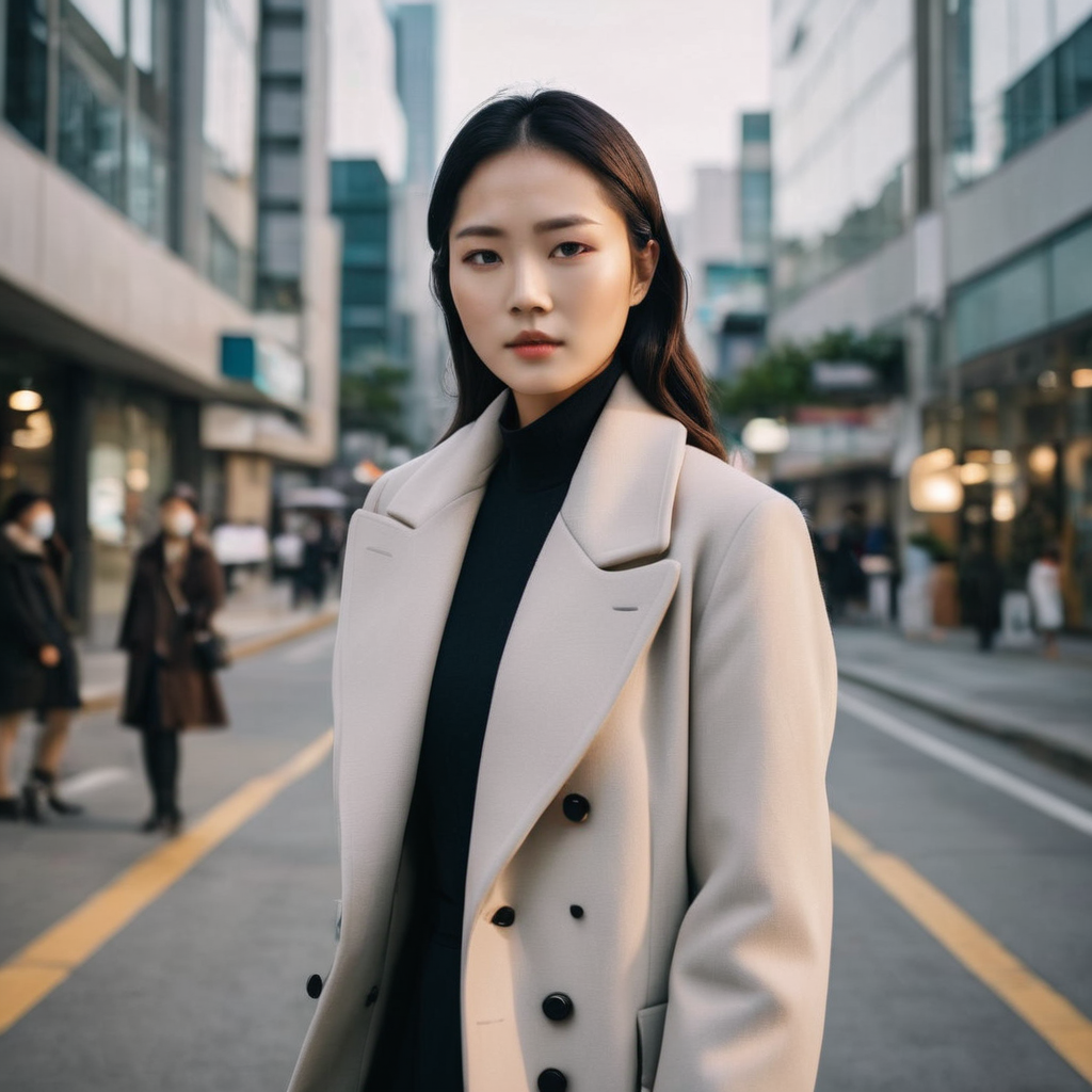 Amidst bustling streets, a Korean woman strides gracefully, her overcoat draped with timeless elegance. Amidst the flurry of busy people, she stands out with poise and grace, embodying the essence of sophistication. The garment’s sleek lines accentuate her figure, while her demeanor exudes confidence and quiet strength. In the midst of urban chaos, she remains a beacon of understated beauty, a symbol of tradition and modernity seamlessly intertwined.