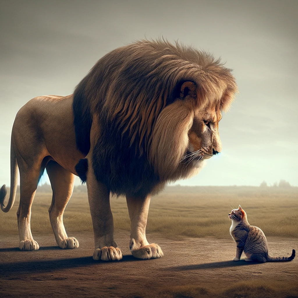 In an imaginative tableau, a majestic lion and a diminutive domestic cat stand locked in a tense face-off, representing the confrontation between the untamed wilderness and the comforts of domesticity. The lion exudes raw power and primal instinct, while the cat embodies cunning and adaptability, a clash of two worlds colliding in a moment frozen in time.