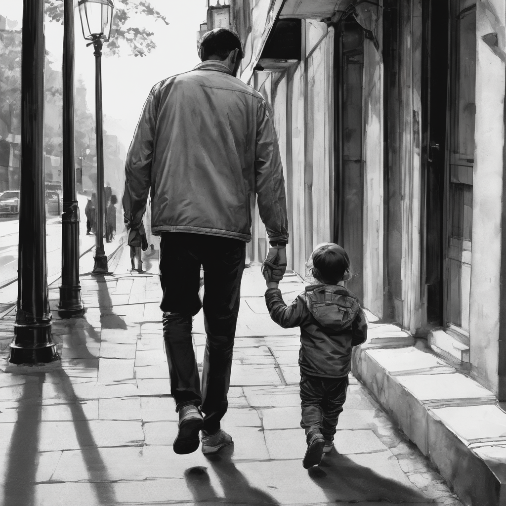 A tender tableau unfolds as a father walks along a sidewalk, gently holding his child’s arm. Their backs face the observer, creating a silhouette against the world around them. The father’s protective stance and the child’s trusting gesture tell a story of familial connection. The sidewalk becomes a path of shared moments, echoing the unspoken bond between parent and child—a journey filled with guidance, love, and the simplicity of a walk together.