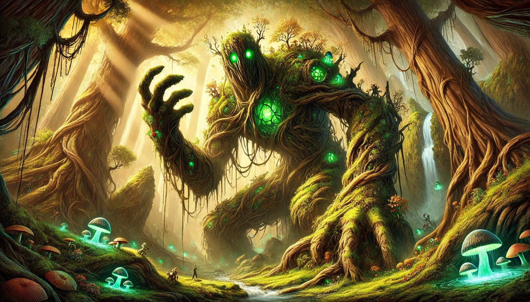This illustration depicts a colossal earth elemental emerging from the heart of an enchanted forest. Its towering form is composed of ancient, moss-covered stone, intertwined with gnarled roots and vibrant green vines. Glowing emerald eyes radiate wisdom and primal power, while its massive hands grip the forest floor, causing cracks to form as new plant life sprouts in its wake. Small glowing fungi and enchanted flowers bloom along its limbs, symbolizing its deep connection to nature’s life force.
