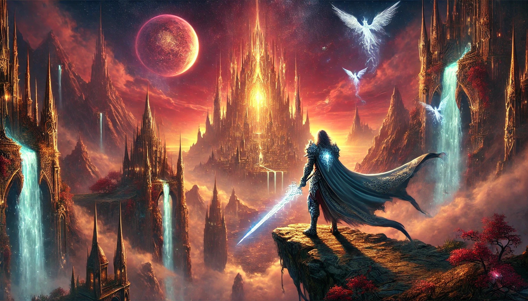 The illustration depicts a breathtaking fantasy scene with a warrior standing on the edge of a towering cliff, overlooking an enchanted city bathed in the glow of a crimson twilight sky. The warrior is clad in intricate silver armor, a flowing blue cape billowing behind him, and wields a gleaming sword radiating mystical energy. His stance is strong and determined as he surveys the ancient metropolis below.