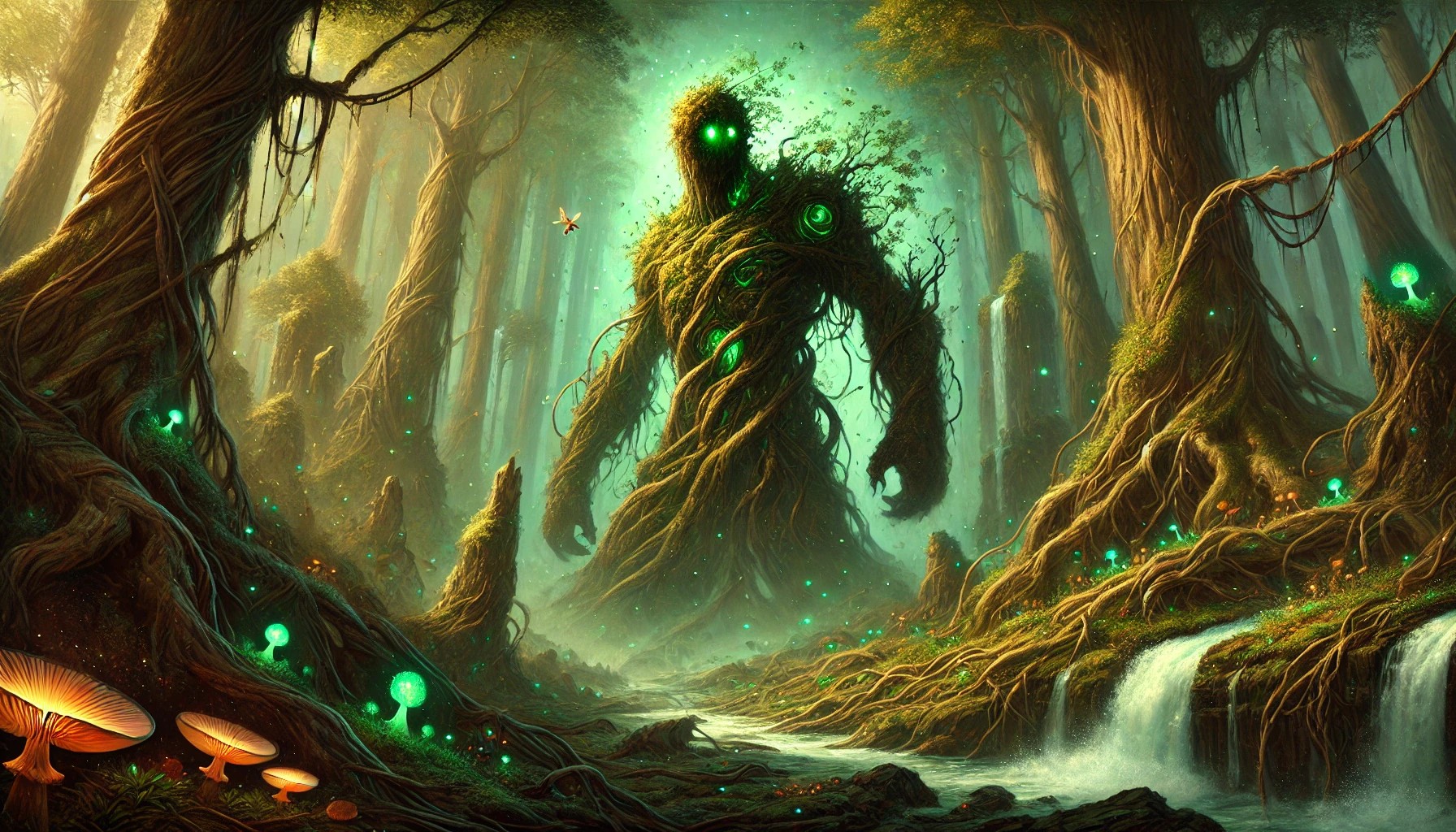 A fantasy illustration of an ancient earth elemental emerging from a dense, mystical forest.