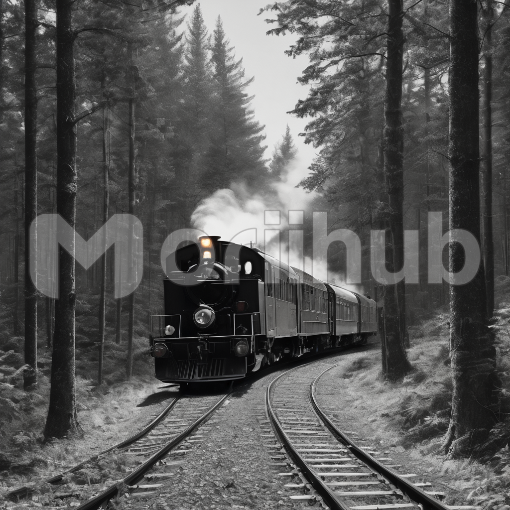 A train chugs steadily through a dense forest, its rhythmic movement echoing in the tranquil woods. Tall trees envelop the tracks, creating a tunnel of greenery. The sky above wears a somber shroud of gray, casting a muted light over the scene. As the locomotive carves a path through the wilderness, the juxtaposition of human industry and the untouched woods creates a striking blend of nature and machinery.