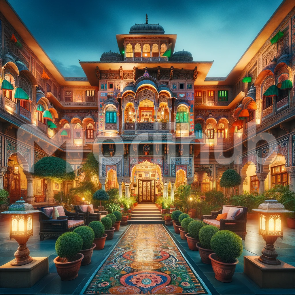 A traditional Indian hotel, a symphony of architectural beauty and cultural opulence. Its facade, resplendent with intricate carvings, ornate arches, and vibrant colors, welcomes guests with open arms. A mosaic of heritage and hospitality, it exudes the timeless charm of India’s rich culture, beckoning travelers to immerse themselves in its warm embrace.