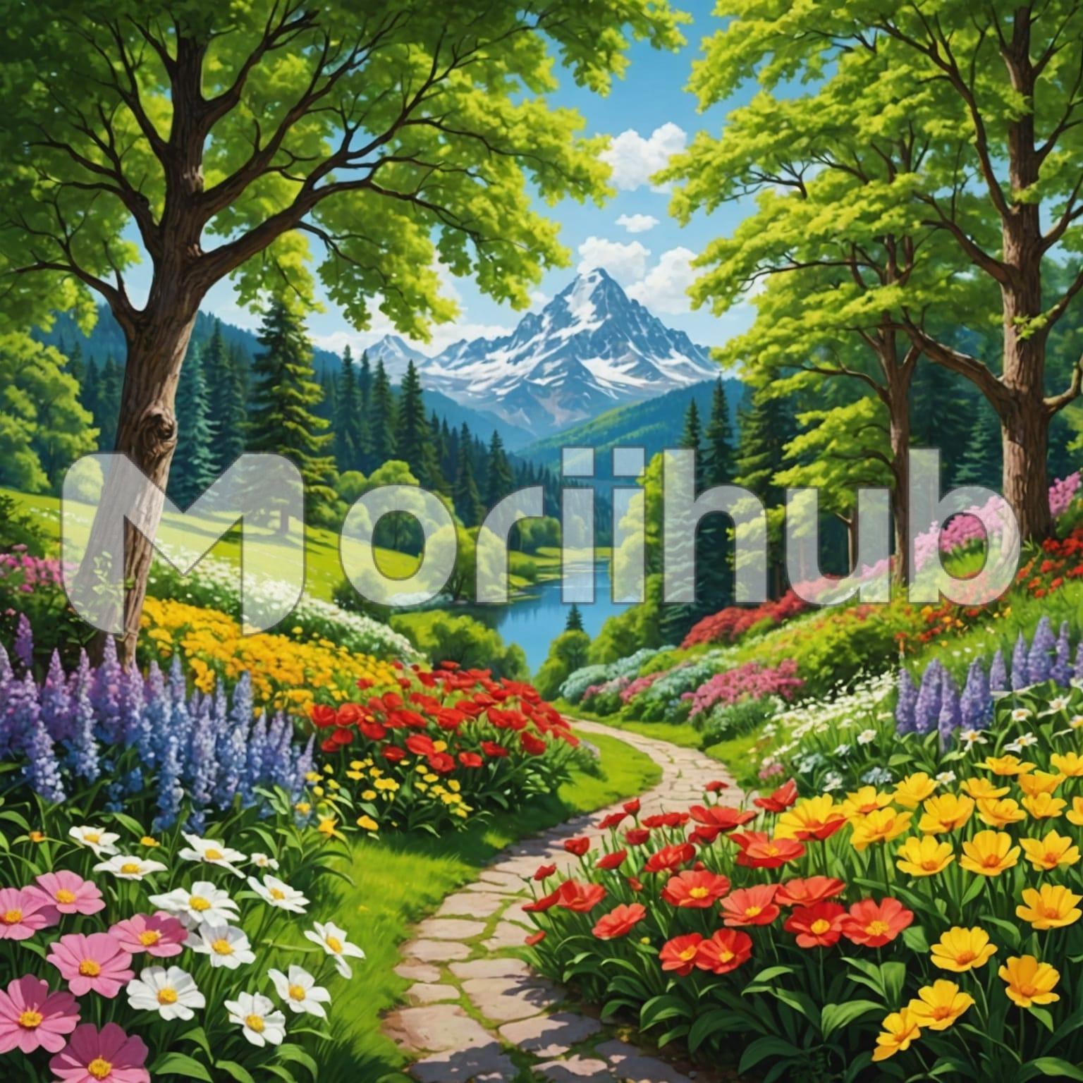A cobblestone path winds gracefully through a vibrant floral field, where a tapestry of wildflowers blooms in riotous hues. Lush greenery lines the edges, forming a natural frame that guides the way forward. In the distance, majestic mountains stand sentinel, their peaks dusted with the remnants of winter’s snow. The air is alive with the scent of earth and blossoms, a gentle breeze carrying whispers of distant streams. As sunlight dances through the leaves overhead, the scene unfolds in tranquil harmony, inviting wanderers to tread lightly upon this path of natural splendor.