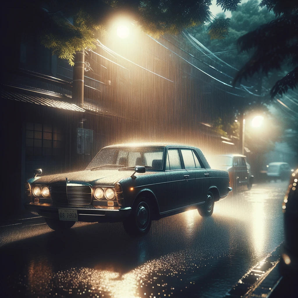 As the rain falls softly onto the parked car, each raindrop dances upon its surface, creating a mesmerizing symphony of pitter-patter. The serene scene unfolds in a quiet street, illuminated by the gentle glow of dimly lit street lamps, casting elongated shadows of nearby trees. Each raindrop carries with it a whisper of tranquility, enveloping the scene in a peaceful embrace. The rhythmic tapping of rain against metal becomes a soothing melody, echoing through the stillness of the night, as if nature herself is serenading the world to sleep.