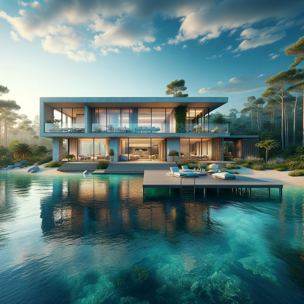 Imagine a serene and luxurious home poised gracefully on the edge of a pristine, clear water body. With sleek lines and minimalist design, this residence embodies modern architecture at its finest. Floor-to-ceiling windows offer uninterrupted views of the tranquil surroundings, blurring the boundaries between indoor and outdoor living. Inside, luxurious amenities and exquisite finishes create an atmosphere of refined elegance. Outside, a private oasis awaits, inviting residents to relax and unwind amidst the beauty of nature. This home is the epitome of sophisticated living, where contemporary style meets tranquil waterfront bliss.