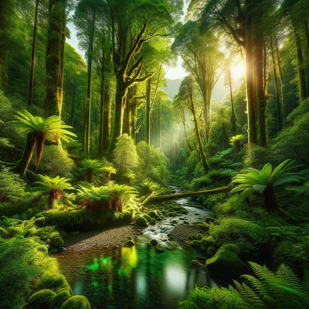 In this breathtaking landscape, lush greenery envelops a dense forest where towering trees boast thick, vibrant foliage. A clear, meandering stream cuts through the verdant expanse, its gentle flow adding to the tranquility of the scene. Nature’s symphony echoes through the forest, inviting visitors to immerse themselves in its serene beauty and timeless charm.