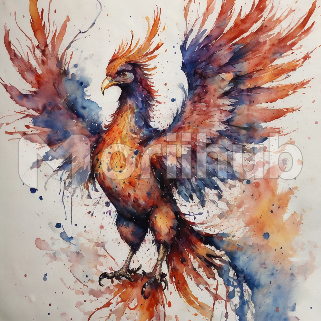 A phoenix emerges in ethereal watercolors upon canvas. Vibrant hues blend gracefully, as the mythical bird rises from the ashes, its fiery plumage a breathtaking cascade of oranges, reds, and golds. With wings outstretched and eyes aflame, it embodies rebirth and transcendence. The fluid strokes of watercolor create a mesmerizing dance of colors, conveying both the phoenix’s fiery spirit and its graceful resurrection, a masterpiece that captures the essence of myth and transformation.