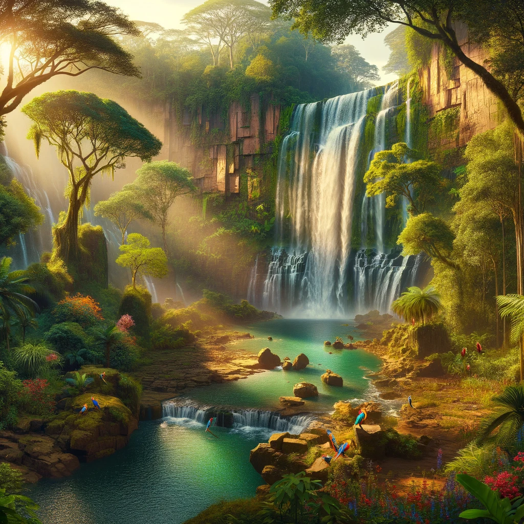 Nestled within the heart of Africa lies a mesmerizing spectacle: a majestic waterfall cascades gracefully down rugged, rocky ledges, its pristine waters glistening in the sunlight. Surrounded by lush, verdant vegetation, the scene is a harmonious blend of natural beauty and raw power, inviting awe and wonder with every cascade.